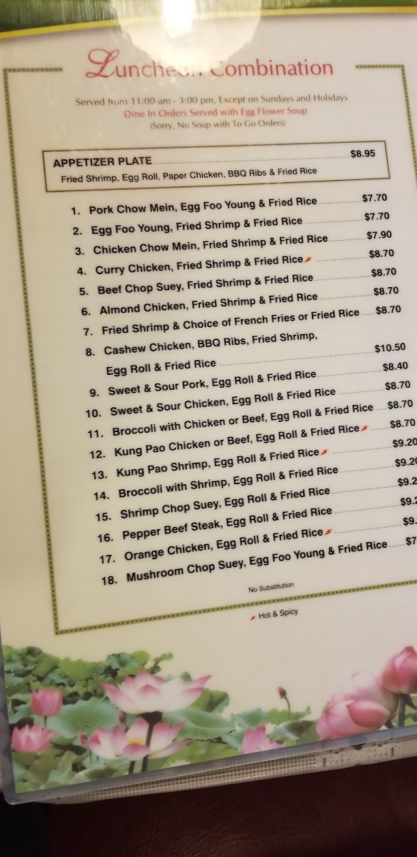 Lotus Delux chow mein, paper chicken, egg flower soup, egg roll, kung pao chicken (hot and spicy), fried shrimp, fried rice, pineapple chicken.